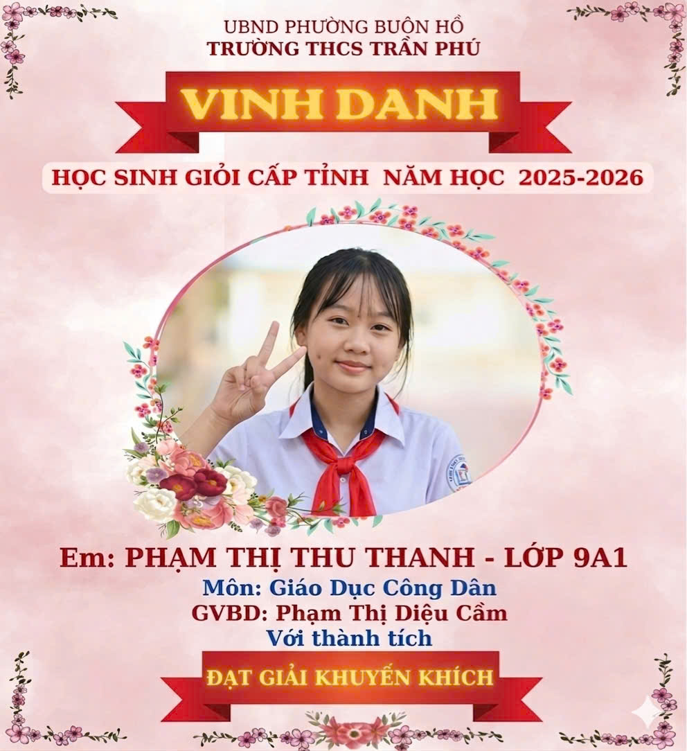Trường THCS Trần Phú trân trọng ghi nhận và vinh danh thành tích học sinh giỏi cấp tỉnh năm học 2025–2026 với niềm tự hào sâu sắc. Trong đó, em Phạm Thị Thu Thanh – học sinh lớp 9A1, đã xuất sắc đạt giải Khuyến khích môn Giáo dục công dân cấp tỉnh. Đây là kết quả của quá trình nỗ lực bền bỉ, tinh thần học tập nghiêm túc và ý chí vươn lên không ngừng của em. Thành tích này không chỉ là niềm vui của riêng em mà còn là niềm tự hào chung của tập thể nhà trường. Bên cạnh đó, Trường THCS Trần Phú cũng trân trọng ghi nhận sự tận tâm của cô Phạm Thị Diệu Cầm – giáo viên đã trực tiếp bồi dưỡng em trong suốt quá trình ôn luyện. Sự hướng dẫn tận tình và trách nhiệm của cô đã góp phần quan trọng giúp em đạt được kết quả đáng quý này. Nhà trường tin rằng đây sẽ là động lực để em tiếp tục phấn đấu và chinh phục những thành công cao hơn trong tương lai. Đồng thời, thành tích của em cũng lan tỏa tinh thần học tập tích cực đến các bạn học sinh khác. Trường THCS Trần Phú xin gửi lời chúc mừng chân thành đến em Phạm Thị Thu Thanh và cô Phạm Thị Diệu Cầm. Chúc em luôn giữ vững niềm đam mê học tập và gặt hái thêm nhiều thành tích đáng tự hào hơn nữa.